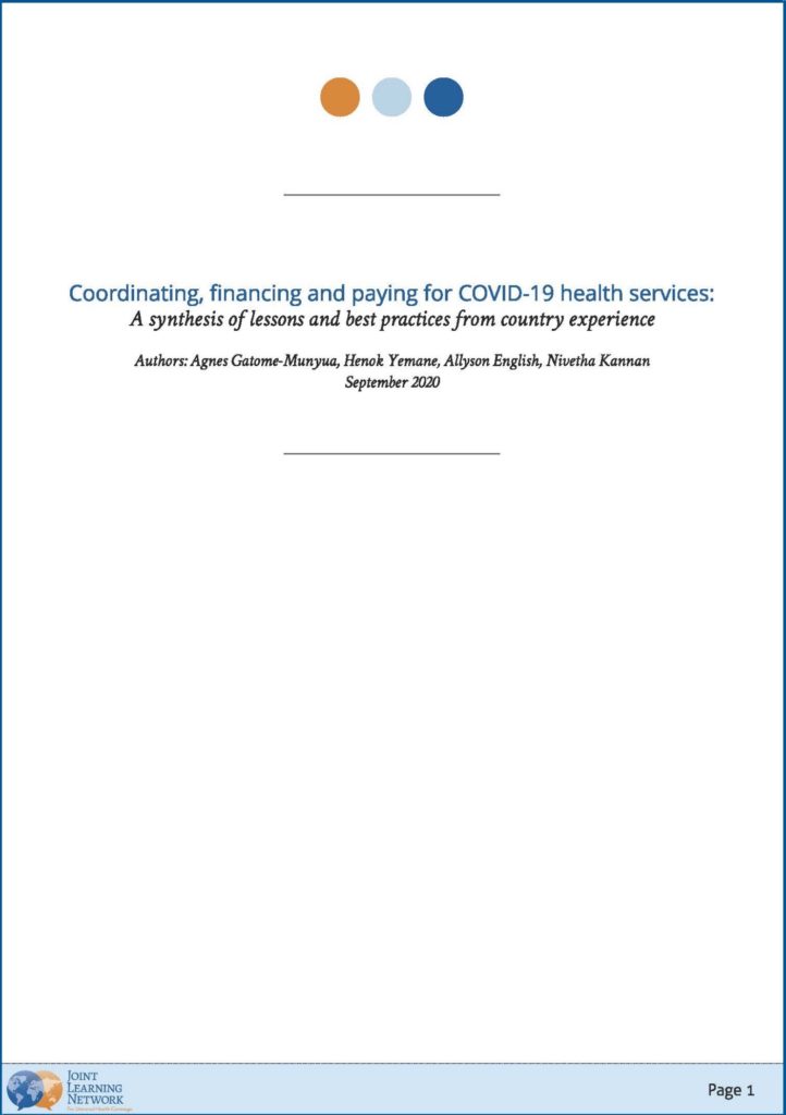 This report includes six case studies sharing how Bangladesh, China, Kenya, Nigeria, the Philippines, and the Republic of Korea have coordinated their COVID-19 pandemic responses. The case studies, which were developed by the JLN Primary Healthcare (PHC) Financing and Payment Collaborative sub-group, also cover how these countries are financing and paying for essential health services at the primary health care level. [...]